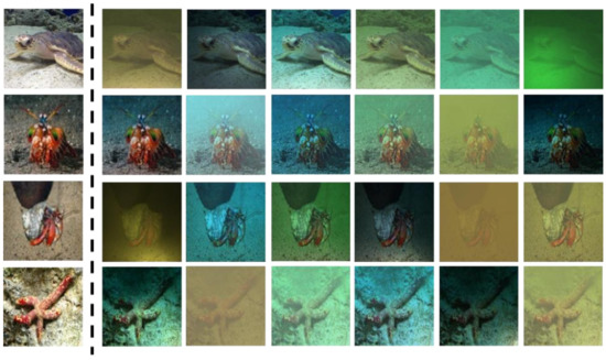 After the simulation of all aforementioned parameters, underwater images can be generated by substituting corresponding parameters in Equation (8). In Figure 5, we present some samples of simulated underwater images generated by the proposed method. Obviously, the proposed method is able to generate various degradation appearances for a given image, including images with deviated color, low contrast, and insufficient lighting.
