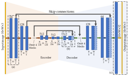 Architecture of the proposed underwater image enhancement network. Dotted-line frame (a) is an encoder block, (b) is a decoder block, (c) is the output block. All encoder blocks have same structure, and so are the decoder blocks but the last output block. Details of the encoder block, decoder block, and output block are given in Figure 7.