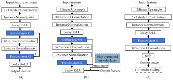 The decoder block is also composed of two sets of convolution, instance normalization, and leaky ReLU operations, but at the beginning of the first set, we add a bilinear interpolation operation to up-sample the input feature maps, then use a stride 1 convolution to get deeper feature maps from the upscaled input. The number of output feature maps is changed inversely to that in the encoder part. Considering the possible information loss in the long path of feature map transmission in the backbone of the network, we also add skip connections to directly pass the output feature maps of the encoder blocks to the corresponding decoder blocks, as done in the U-Net [13]. More specifically, the skip connection creates a bypath for the feature maps produced by the encoder block so that they can be directly concatenated after the decoded feature maps of the same resolution as them and fed into the following decoder block of the next resolution level.