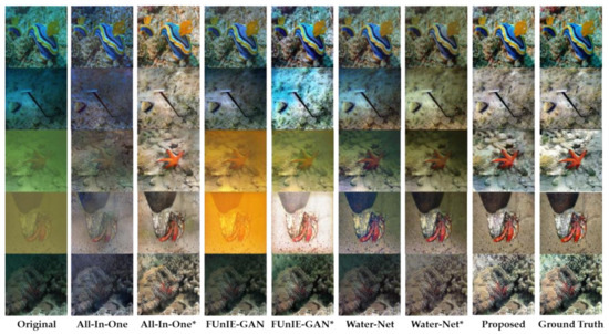 The three retrained networks, i.e., All-In-One*, FUnIE-GAN*, and Water-Net*, performed better than the corresponding original networks but worse than the proposed method. In Figure 9, all result images of the retrained networks have more balanced color than those of their original counterparts, and All-In-One* and Water-Net* also managed to improve the visibility of low light regions in the tested images. The quantitative results of All-In-One* and FUnIE-GAN* are also better than their corresponding original network as shown in Table 5. Water-Net* sees better result in terms of edge intensity but worse scores in color deviation and information content, which might be due to its low color richness and small intensity range.