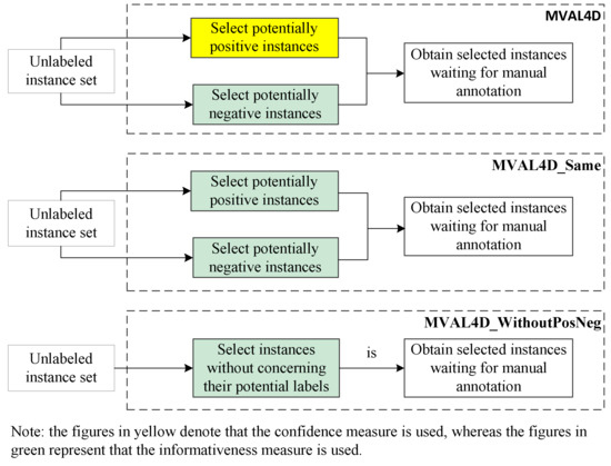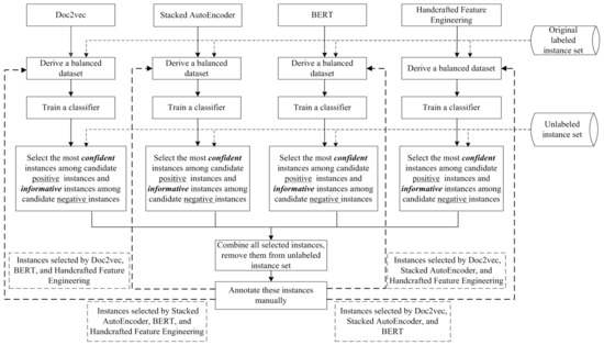 As an important component of active learning, instance selection measures can be categorized into two groups (i.e., representativeness and informativeness) [32]. Representativeness-based active learning methods attempt to select instances that can represent the entire corpus. Diversity [28], density [30], and clustering analysis [29] are primary representativeness measures. In contrast, informativeness-based methods tend to select instances with a high degree of uncertainty, which is measured based on predictive error [27] or the degree of disagreement among different classifiers [30,33]. For example, co-testing [33] selects instances from those that received inconsistent pseudo labels in different views. To make active learning models more reliable and effective, recent literature has attempted to integrate multiple query criteria [28,30,32]. Cai et al. [27] adopted a self-defined strategy considering the uncertainty of an instance and its frequency of occurrence. Yan et al. [28] combined cross-media uncertainty and diversity. Chen et al. [30] proposed a novel integrated selection strategy considering both the degree of disagreement and regional density.