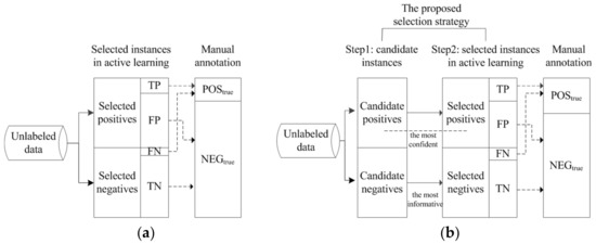 A low confidence represents a high informativeness. Therefore, to select the most informative instances, candidate negative instances are sorted in ascending order based on the confidence computed using Equation (4). Then, the top-ranked instances are regarded as potentially negative instances, which are selected for manual annotation.