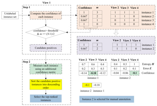 Candidate positive instances are sorted in descending order based on the confidence computed using Equation (2). Then, the top-ranked instances are regarded as potentially positive instances, which are selected for manual annotation. An illustrated example from the perspective of View 1 is described in Figure 3. For other views, the positive instance selection strategy works in the same way.