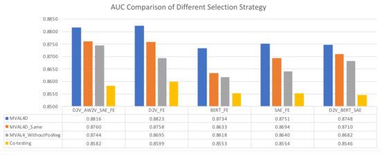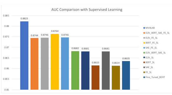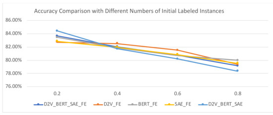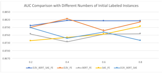 To validate the effectiveness of MVAL4D with different numbers of initial labeled instances, we used 20%, 40%, 60%, and 80% training data as the initial labeled data and the rest of the training data as unlabeled data. In terms of accuracy, as depicted in Figure 7 and Figure 8, with the increasing numbers of initial labeled data, the accuracy values present a decreased trend, while the trend of AUC values is not obvious. Therefore, the perfect moment to start implementing MVAL4D is not easy to determine. In this case, we can use the model obtained using all document representations (i.e., “D2V_AW2V_SAE_FE”) since it is the most robust across different numbers of initial labeled instances.