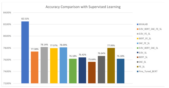 We employed SVM as the classification algorithm following prior studies [8,14] and implemented it using LibSVM in WEKA Waikato Environment for Knowledge Analysis (WEKA) (http://www.cs.waikato.ac.nz/mL/weka/ (accessed on 15 March 2020)) package. The initial labeled rate is set at 40% for all experiments except Experiment C to guarantee the accuracy of the classifiers and to allow sufficient room for active learning. The in Algorithm 1 is set to be 0.4 for all experiments. We used the genism (https://radimrehurek.com/gensim/ (accessed on 1 April 2020)) package to implement doc2vec. We adopted the released pre-trained model, specifically the BERT-base and uncased model, without performing fine-tuning. The hidden dimensionalities for each layer in the SAE model were 10,000, 5000, and 300, respectively. BERT was implemented using TensorFlow. We used a release source code (http://diego.asu.edu/Publications/ADRClassify.html (accessed on 15 March 2020)) to conduct the handcrafted feature engineering. The proposed MVAL4D approach was implemented in-house using WEKA.jar. We conducted parameter tuning to determine several parameters’ values, which are listed in Table 2. Except when stated otherwise, we used default values of other parameters.