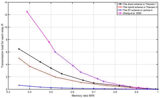Finally, when , , and , the memory–load and memory–subpacketization tradeoffs are given in Figure 2. From Figure 2, we can see that for the same number of users and memory ratio, the schemes with transmission load for each relay from small to large are the ZY scheme, the hybrid scheme, the direct scheme and the naive scheme. This is because ZY scheme fully utilizes the multicast opportunities among the users who are connected to the same relay, then its coded caching gain is the largest, so it has the minimum transmission load for each relay; the direct scheme and the naive scheme only utilize the multicast opportunities among the users who are connected to different sets of r relays, while omitting the multicast opportunities among the users who are connected to the same r relays; however, the direct scheme more efficiently utilizes the multicast opportunities among the users who are connected to different sets of r relays than the naive scheme, so the transmission load for each relay of the direct scheme is lower than that of the naive scheme; the hybrid scheme not only utilizes the multicast opportunities among the users who are connected to different sets of r relays as the direct scheme, but also utilizes the multicast opportunities among the users who are connected to the same r relays, so its transmission load for each relay is lower than that of the direct scheme. From Figure 2, we can see that for the same number of users and memory ratio, the schemes with subpacketization from small to large are the direct scheme, the naive scheme, the hybrid scheme and the ZY scheme. Therefore, the direct scheme and the hybrid scheme have significant advantages in subpacketization compared with the ZY scheme and have significant advantages in transmission load for each relay compared with the naive scheme. Moreover, the subpacketization of the direct scheme is lower than that of the naive scheme.