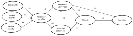 Based on to the values represented at Table 5, the beta value of System quality was −0.017 with significance level p > 0.05 (p = 0.907). Thus, System quality does not significantly influence Perceived benefits, and H1 was not supported. The beta value of Data quality was 0.201 with significance level p > 0.05 (p = 0.207). Thus, Data quality does not significantly influence Perceived benefits, and H2 was not supported. The beta value of Service quality was 0.455 with significance level p < 0.05 (p = 0.003). Thus, Service quality significantly affects Perceived benefits, and H3 was supported. The beta value of Perceived ease of use was 0.546 with significance level p < 0.001 (p = 0.000). Thus, Perceived ease of use has a significant impact on Attitude, and H4 was supported. The beta value of Perceived usefulness was 0.615 with significance level p < 0.001 (p = 0.000). Thus, Perceived usefulness significantly affects Attitude, and H5 was supported. The beta value of Perceived usefulness was 0.665 with significance level p < 0.001 (p = 0.000). Thus, Perceived usefulness significantly affects Intention to use, and H6 was supported. The beta value of Attitude was 0.800 with significance level p < 0.001 (p = 0.000). Thus, Attitude significantly affects Intention to use, and H7 was supported. The beta value of Perceived ease of use was 0.925 with significance level p < 0.001 (p = 0.000). Thus, Perceived ease of use has a significant impact on Perceived usefulness, and H8 was supported. The beta value of Perceived benefits was 0.614 with significance level p < 0.001 (p = 0.000). Thus, Perceived benefits significantly affect the Perceived usefulness, and H9 was supported. The beta value of Perceived benefits was 0.592 with significance level p < 0.001 (p = 0.000). Thus, Perceived benefits significantly affect the Perceived ease of use, and H10 was supported.