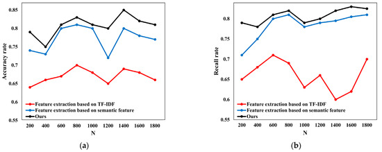 To verify the text representation effect of the feature extraction algorithm, this paper compares the classification effect of different feature extraction algorithms on the same classification model. Figure 2a,b shows the accuracy and recall comparisons of different feature extraction algorithms. It can be seen from Figure 2 that the algorithm proposed in this paper can achieve better results when dealing with different numbers of text data sets, so it has a better effect on the representation of text information and can extract low-frequency information with rich semantics.