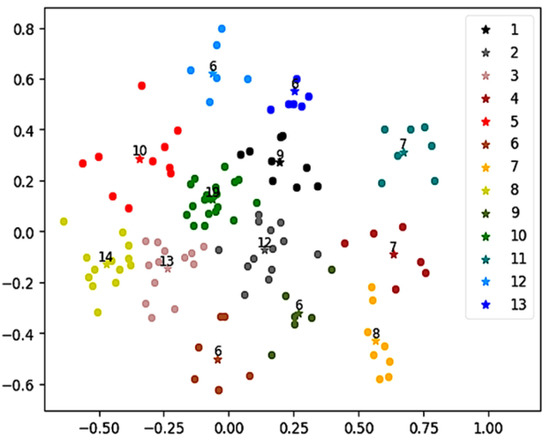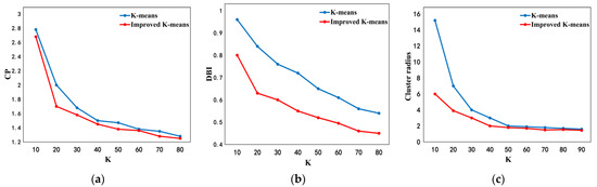 where represents the average distance between each point and the cluster center in one group, K represents the number of clusters and represents the center of cluster i. The lower the CP is, the smaller the clustering distance and the more similar the members are.