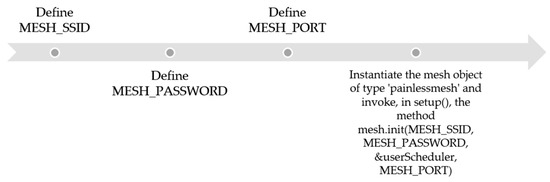 After installing the painlessMesh library in the Arduino IDE, the first step was to choose the parameters that are set on all nodes to form the mesh network: the SSID, the port, and the password to access the network. The port needed to be selected so as to not conflict with those used by well-known applications and protocols. The steps are illustrated in Figure 3.