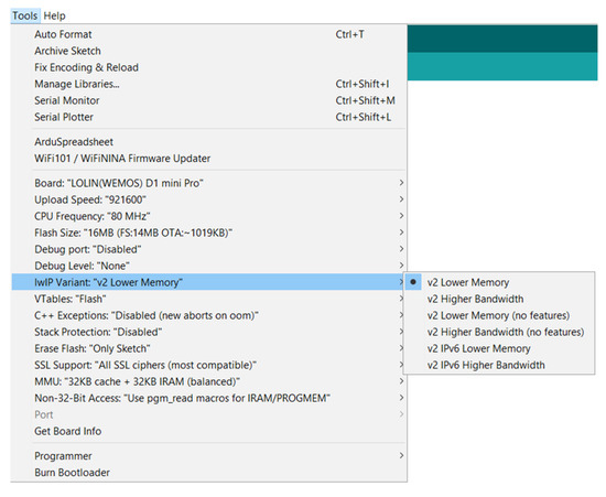The two configurations available for the IwIP Variant (MSS = 536 bytes and 1460 bytes) were also tested. All the other settings were set by default, namely, the CPU frequency, which was kept at 80 MHz. The configuration of the devices was performed entirely through the Arduino IDE. The algorithm developed for the nodes was prepared to output data through serial communication. Thus, the serial monitor feature of the Arduino IDE and the PuTTY application [35] were used to present that data.