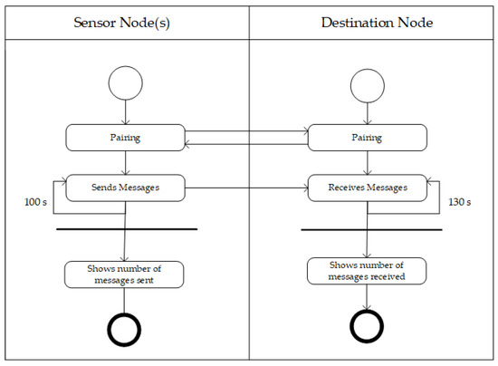 Figure 5 illustrates the process of pairing one or more sensor nodes and the destination node and the flow of message exchange. Figure 6 describes the algorithm used for message exchange. After setting the parameters of the experiment (i.e., message send rate, payload size, and type of communication), sensor(s) and destination nodes paired. Then, message transmission was initiated and executed during a predefined period of time. Both sensor(s) and destination nodes counted the number of messages successfully sent or received during that time. The destination node had additional time to process and count them. The count was printed at the end. Unicast messages were sent using the sendSingle() method from the painlessMesh library. This method needs to identify the ID of the destination node.