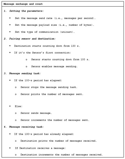 Different traffic loads (1 to 10 messages per second) and message payload sizes (10, 25, 50, 100, 250, 500, 750, and 2000 bytes) were considered under unicast transmissions. The taskSendMessage() method was responsible for sending messages. This method was scheduled in the algorithm at fixed time intervals. Thus, the greater the number of messages to be sent, the shorter that interval was.