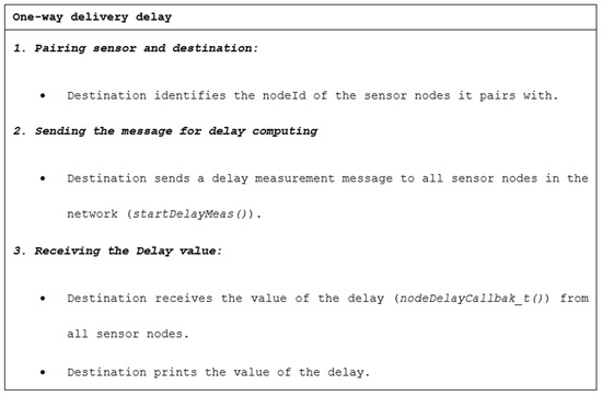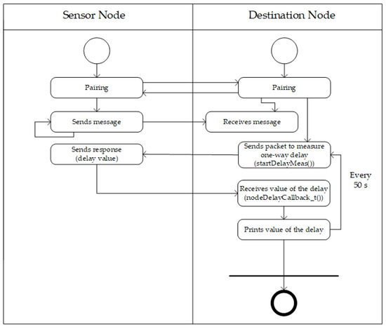 Figure 7 illustrates the process of pairing the sensor(s) and destination nodes and the message exchange between them that allowed the determination of the one-way delivery delay. Figure 8 describes the algorithm used to obtain information about the one-way delivery delay. According to painlessMesh API documentation [34], this library provides startDelayMeas() and nodeDelayCallbak_t() methods to measure the one-way delivery delay. The first method (startDelayMeas()) was called by the destination node to send a message to the sensor node. Then, the destination node waited for the sensor node’s response to that message. The sensor node, after receiving the message from the destination node, returned a response with the value of delivery delay obtained by the startDelayMeas() method. This response message triggered the callback method (nodeDelayCallbak_t()) on the destination node, and the delivery delay value was extracted from the received message.
