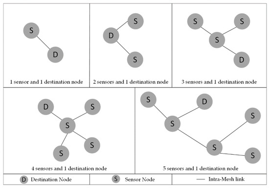 Due to the requirements of the PrunusPós project [7], the performance of the WMN was evaluated in the scenarios illustrated in Figure 9. The network topologies presented in Figure 9 should be considered as a mere example, since this task is part of painlessMesh library management. The scenarios were composed of a varying number of sensor nodes (1 to 5), which repeatedly send messages, and a single destination node that attempts to receive them. The nodes were evenly positioned inside an area of 7 m × 2.5 m similar to the size of a 26 ft truck’s refrigerated container.