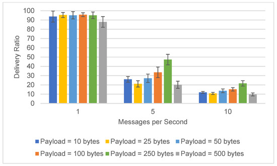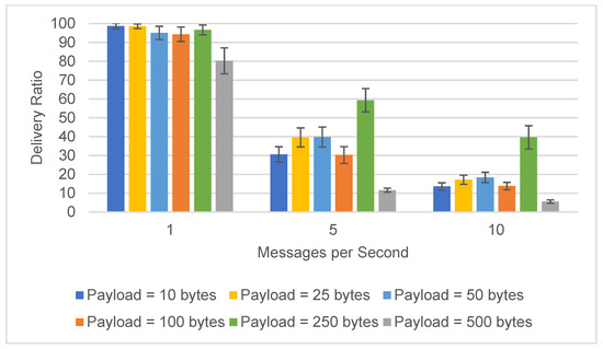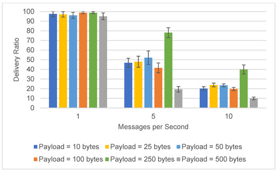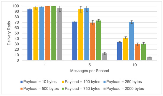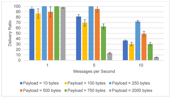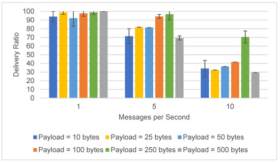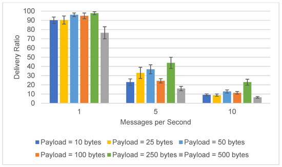 An occurrence common to all scenarios was verified when using 250 bytes payload messages. Regardless of the number of nodes in the network, this was the payload that registered the highest delivery ratio, sending five or ten messages per second. This situation cannot be dissociated from the fact that the packets had a maximum segment size of 536 bytes and were, therefore, the ones that took better advantage of this dimension.