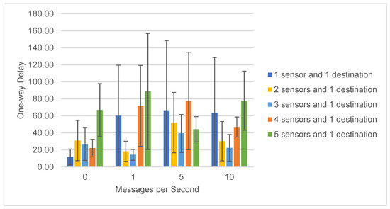 The results for the one-way delivery delay measurement experiments (Figure 17) are presented as follows. This experiment was performed with different numbers of sensor nodes in the network (between 1 and 5). It is important to mention that the mesh network topology was managed by the painlessMesh library itself. To evaluate the impact of network congestion on delivery delay, message exchange between nodes was introduced. The message sending rate varied from no messages exchanged to 1, 5, and 10 messages exchanged per second by each sensor. Due to the previous findings, this experiment used the MSS = 536 bytes configuration and a 250 bytes payload messages.