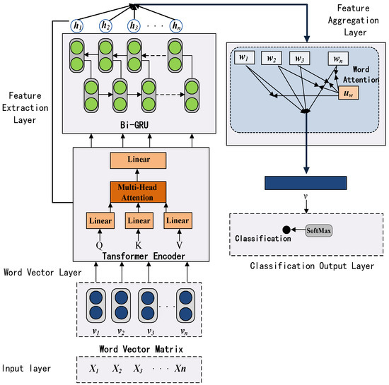 As shown in Figure 2, in this paper, all the questions are first represented by word vectors, then input to the embedding layer, and then successively entered into the Transformer and Bi-GRU double-layer networks, giving full play to the respective advantages of Transformer and Bi-GRU and complementing each other, keeping the features of the question and extracting the features, then focusing on and identifying the features of important words and sentences through attention, and aggregating the features of the upper two layers; finally, the final result of the classification is obtained through the Softmax classifier.