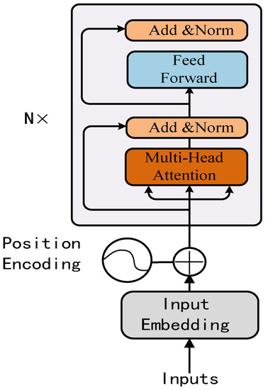 The structure of Transformer encoder is shown in the Figure 3. First, positional encoding is introduced, which exists to interpret the order of words in the input sequence and to determine the positional information of the words. In order to enable parallel operations, the attention mechanism drops the order that is important in the temporal sequence, and, if a sequence is disrupted, then the semantics also changes, which is solved by introducing positional encoding. The dimensionality of positional encoding is the same as that of embedding.