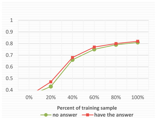 As shown in Figure 6, first of all, we use the Text-CNN model on the YAHOO dataset to compare 600 single question sentences with questions containing answer information. As shown in the figure, the results show that adding an answer and not adding an answer is two to three percentage points higher. It shows that the classification effect is better after adding the answer information to enrich the question feature information. It also shows that the Chinese question and answer dataset constructed in this article has a certain meaning. On the one hand, it can improve the classification accuracy and, on the other hand, it can provide convenience for subsequent answer extraction tasks.