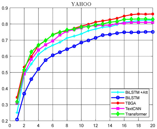As shown in Table 5, it can be seen from the results that LSTM has the worst effect on the TREC dataset, and it is basically the same as the Transformer after the attention mechanism is added. In general, the classification effect of TREC is better than that of YahooAns and OQA, mainly because the TREC dataset is composed of question sentences and has no answer information. Compared with the latter, it is relatively simple. The classification effect of OQA is the lowest due to community questions and answers, such as Baidu Know and Sogou QA. The questions on the platform are more complex, with many abbreviated and colloquial uses of vocabulary and sentences, and they also contain complex answer information.