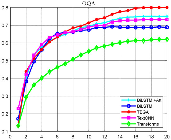 The model TBGA achieves ideal results on questions containing answer information. In addition, the addition of an attention mechanism is indeed effective, which can capture the text characteristics to be represented. Especially on the OQA dataset, compared with the traditional CNN method, the accuracy has been improved by 4.75%. Transformer has the worst effect. The main reason is that the amount of data offline is relatively high, and the effect of longer question and answer sentences containing answers is not good. This is also caused by insufficient long-distance dependence. LSTM is not effective, insufficient feature extraction is the main reason. Transformer is used as a strong feature extractor, and long-distance dependence is supplemented by improved Bi-GRU. At the same time, more features are extracted through the hidden layer, and, finally, the attention mechanism is used to highlight important question information and feature fusion so as to give play to their respective advantages and complement each other to improve the classification effect. In summary, on the English question dataset and on the Chinese question and answer dataset, the method proposed in this paper has significant advantages. The improvement of the effect on different datasets also shows the effectiveness and comparison of the method, with strong generalization ability.