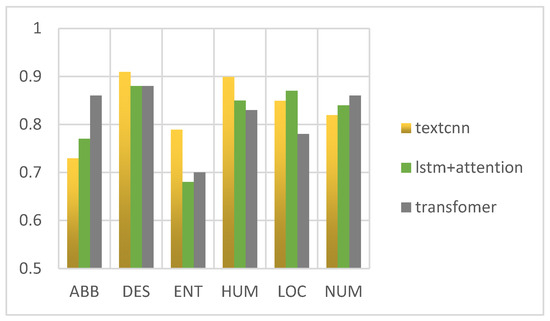 In addition, as shown in Figure 10, by comparing the F1 values of each category on the TREC dataset for commonly used text classification models: convolutional network and RNN network plus attention mechanism and multi-head attention network, it can be found that the abbreviated category (ABB) question has the most effect. A good model is Transformer. On the statement type (DES) question, the CNN model is relatively effective. The model that works best in ENT (entity class) is also the CNN network. For the character category (HUM) question, the Transformer model has the best effect. For the place name category (LOC) question, the RNN plus attention model has the best effect. On the number category (NUM) question, the Transformer model has the best effect. It is found through experiments that different networks have different performances in different categories. This has a certain enlightening effect on the classification of problems in specific domain categories with corresponding models.
