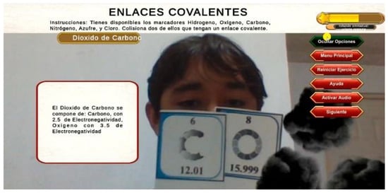 ReAQ provides AR learning activities to cover the main concepts of five topics: (1–3) study of compounds with a covalent, ionic, or metallic bond; (4) acid–base reactions; and (5) the use of chemical elements necessary to sustain life, such as hydrogen or carbon. Students must correctly answer a minimum number of exercises on each topic. Students receive visual feedback when answering each exercise, if the answer is correct the 3D representation of the compound will appear with a short explanation, otherwise a 3D effect will show the problem as it would appear in the real world. ReAQ might provide the necessary conceptual information to solve any exercise if the student requests it (see Figure 1).