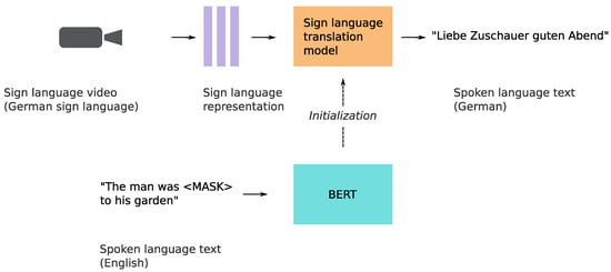 Pretrained language models for many written languages are frequently made publicly available to the scientific community. The Hugging Face Model Hub serves over thirty-five thousand models at the time of writing: https://huggingface.co/models (accessed on 21 April 2022). These pretrained models can be used for downstream tasks such as text summarization and question answering, but also to initialize translation models. In our previous work, we used frozen pretrained written language models for SLT on the RWTH-PHOENIX-Weather 2014T dataset in a Sign2(Gloss+Text) set-up []. We observe a potential performance improvement of 1 to 2 BLEU-4 when integrating frozen pretrained transformers.