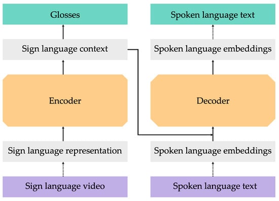 SLT (from a signed to a written language) is a video-to-text translation task. Typically, sign language utterances (as parts of conversations or monologues) are recorded as videos, and these videos need to be translated into written language utterances with the same meaning. As sign languages have no standardized written form, one needs to extract relevant information from these videos to feed to the translation model. Many papers translate from sign language glosses to written language text (e.g., Refs. [,,,,,]). These glosses form a transcription of the sign language video with written language words or clauses. This method is similar to written language MT: they both translate from text to text. However, glosses do not convey the full meaning of what is being signed [,] and they are often influenced by written language [,]. Hence, end-to-end SLT (from video rather than glosses), is required to fully extract the meaning of the sign language utterances. Due to practical hardware limitations, the videos need to be converted into feature vectors before training the translation model: therefore, a powerful offline feature extractor is required. The design of this feature extractor is typically based on SLR techniques. The feature vectors are used as inputs to MT models, which borrow their architecture from written language MT models.