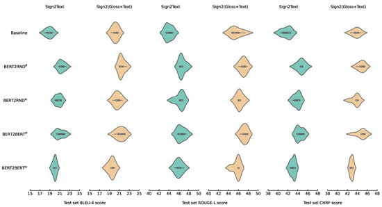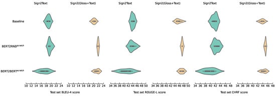 For Sign2Text, using the BERT2RND or BERT2BERT architecture does not yield performance gains. For Sign2(Gloss+Text), we observe slight performance gains compared to the Baseline model.