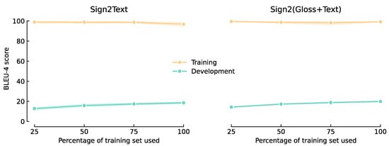 Figure 5 shows the learning curves for Sign2Text on the left and Sign2(Gloss+Text) on the right. Figure 6 zooms in on the development set curve and combines the curves for Sign2Text and Sign2(Gloss+Text) in a single graph. Here, we clearly observe (1) that all models are heavily overfitting to the training set, (2) that Sign2(Gloss+Text) models tend to perform better on unseen data on average, and (3) that the slope of the development set curve is flattening as the size of the training set increases.