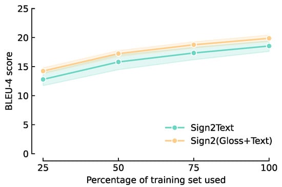 Zooming in on the development set curves of Figure 5, we observe that Sign2(Gloss+Text) models outperform Sign2Text models on average, and that they have lower variance. The slopes, however, are similar.