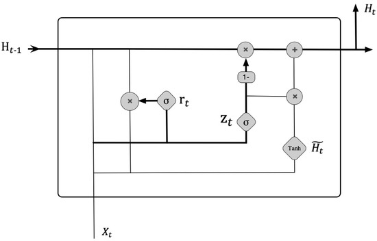 First of all, the hidden state of the last time step is . The calculations of the reset gate and update gate are shown in Formulas (3) and (4), respectively.