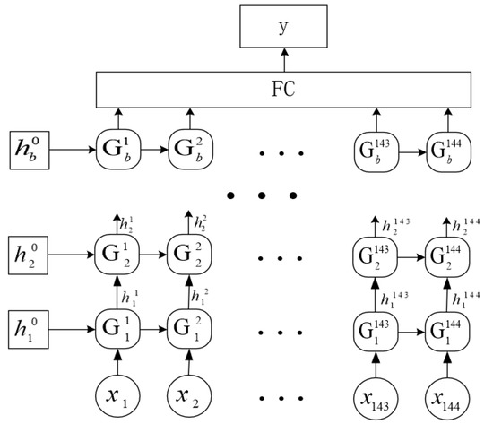 In this paper, we use the genetic algorithm to search the solution domain of the GRU network structures, and the best solution in this paper includes a feature in the hidden state and b hidden layers; its network structure is shown in Figure 2. is the input of the network with B batch size, where 144 is the number of data points of 6 air pollutants in 24 h, and the nth element of x is denoted as . represents the mth structural unit of the lth layer of the network. denotes the output of , while is the initial hidden state of the lth layer. The fully connected network is denoted as FC. A schematic diagram of the proposed GRU neural networks is shown in Figure 2.