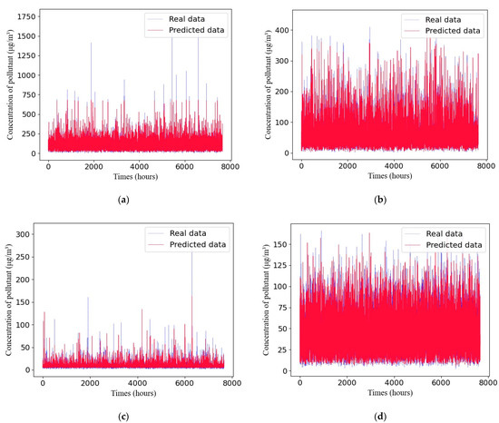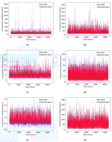 A comparison between the predicted values and true values of different pollutants with the adaptive GRU network in Dataset 3 is shown in Figure 9.