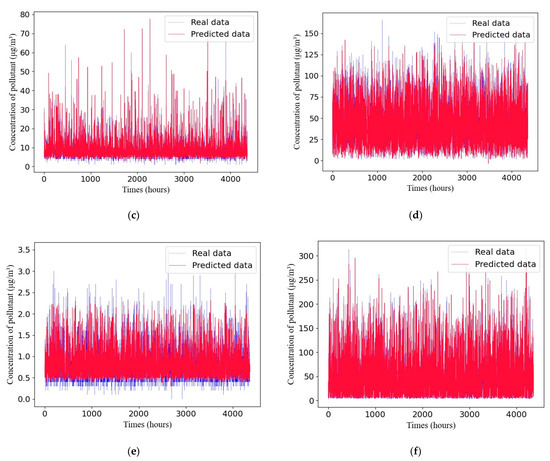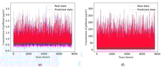Comparison of predicted values and real values of different pollutants with the GRU network in Dataset 2: (a) PM10; (b) PM2.5; (c) SO2; (d) NO2; (e) CO; (f) O3.