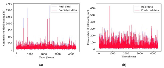 A comparison between the predicted values and true values of different pollutants from the adaptive GRU network in Dataset 2 are shown in Figure 8.