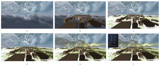 The base rendering pipeline with six steps: (a) skybox rendering, (b) model rendered with one mesh, (c) campus map modeled on a two-dimensional quad, (d) instance rendering of the vegetation directory, (e) volume rendering using ray marching, and (f) IMGUI window rendering.