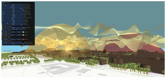 Both the mesh rendering and the volume rendering are OpenGL implementations. We use a bounding cube as an acceleration structure and render the front and back hit points of the bounding cube to a framebuffer object. Then, we use the front- and back-hit points to create the ray representing the light path for that pixel. We step through the volume sampling at each point along the ray. We store the volume data as a flat two-dimensional array. When sampling, we indexed the array based on the latitude and longitude of the sample point and subtracted a value proportional to the z component of the sample position to represent the signal strength fall-off. A traditional volume renderer would take these samples and access a transfer function texture to get a color and opacity at each point on the ray. However, we instead call a function to receive the same information. This function is the Programmable Transfer Function. We then composite all the colors with opacities along the ray to create the final rendering. In order to terminate rays early and allow buildings to occlude the volume, we use the depth buffer from our building rendering; see Figure 2. Early ray termination improves frame rates and provides the occlusion necessary for proper depth perception in the environment. When appropriate, we process multiple volumes by sampling each volume in turn and calculating their respective contribution at each point along the ray. Figure 3 shows the results of this approach. We can implement additional features using various Programmable Transfer Functions from this volume rendering. See in the Figure 4.