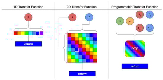 Comparison between (left) one-dimensional, (middle) two-dimensional, and (right) Programmable Transfer Functions. Going from left to right, we observe how the transfer functions generalize to accept a greater number of input parameters. These include view-dependent parameters (v), class labels (c), the vector fields , and their gradients , . Note how the increasing multi-dimensionality is succinctly handled by the Programmable Transfer Functions.