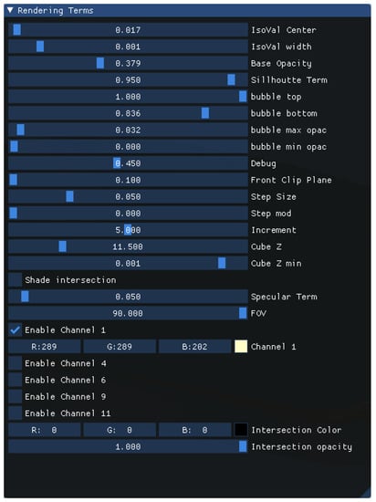 In order to tune the rendering, one only needs to manipulate variables in the GUI with a simple widget, such as a slider or a checkbox, as shown in Figure 9. This ease of use contrasts with how interaction traditionally works, where a new transfer function would have to be computed and stored into a texture.