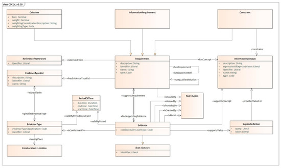 - European Commission. Core Criterion and Core Evidence Vocabulary v2.0.0. 2021. Available online: https://joinup.ec.europa.eu/collection/semantic-interoperability-community-semic/solution/e-government-core-vocabularies/distribution/cccev-200-class-diagram (accessed on 15 March 2022).
