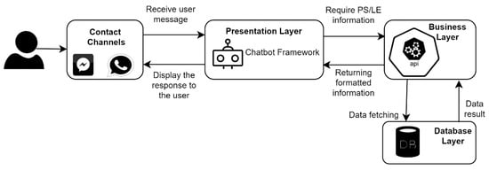 Regarding the “Presentation layer”, the core technology used is the chatbot and needs to meet the following criteria: (i) support for Croatian language, (ii) support social network integration (e.g., Whatsapp, Facebook Messenger), (iii) provide the ability to interact with external REST APIs. Rasa open-source framework was chosen as a framework that fulfills most of the above requirements. Rasa supports NLP and NLU and can communicate with outside services (e.g., REST APIs) through the Rasa Actions Server. Rasa does not natively support the Croatian language. However, it offers the ability to plug-in third party NLU pipelines. Towards this direction, Stanza (https://stanfordnlp.github.io/stanza/ (accessed on 20 April 2022)) was used, which is a Python NLP package providing downloadable pre-trained NLP models for 66 languages including Croatian.