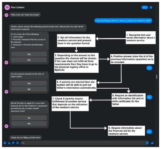 Figure 7. Chatbot dialogue excerpt for the “Newborn PS”. - Retrieves all Information (i.e., questions that are stored based on the Chatbot specific enhancements of CPSV-AP presented in Section 5.2.3) related to this PS, in order to build the questionnaire to be used. The resulting data are structured in a single logical unit and formatted appropriately before being shown to the user (Figure 7, Step 2).