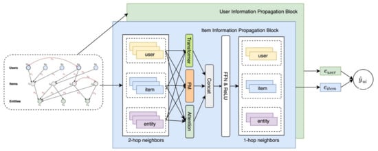 NGCF [] and LightGCN [] enhance user representation by using user–item interactive records and enhance item representation by using interactive user records. SR-GNN [] is the migration of items through iterative propagation based on sequence diagrams to learn representative item representation. KGCN [] and KGAT [] integrate a knowledge graph into recommender systems, which leads to two benefits: (1) rich semantic associations between items can improve the effect of item representation; (2) the interpretability of the recommended results is enhanced.