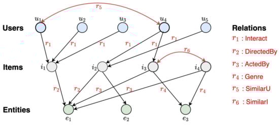 Whether the item–item is connected or not is the same for the user–user. Finally, according to the value of K, we connect the user–user and item–item on the CKG to form an ICKG. As shown in Figure 2, the red arrow indicates the connected edges of similar users, and indicates the connected edges of similar items.