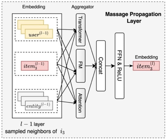 The message propagation layer is the focus of the MAKR model, and the overall structure is shown in Figure 3. In addition to learning the attention scores among the user, item, and entity nodes through the attention mechanism, this layer also uses FM and transformer to learn the cross-features of the different granularity between neighbor nodes. FM focuses on the second-order cross-feature, and transformer focuses on the multi-order cross-feature.