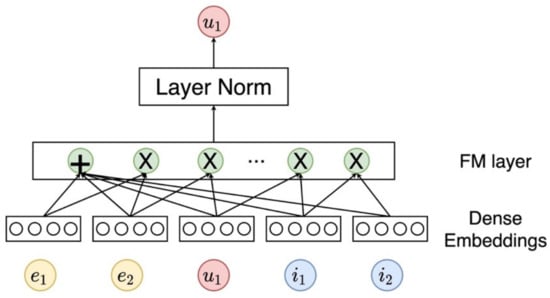 As shown in Figure 4, FM uses the neighbor information of to learn the cross-feature of node . Suppose that the neighbors of user are , and the corresponding features are expressed as . We concatenated these neighbor features and then obtained a new representation of user ’s second-order cross neighbor aggregation through the FM layer.