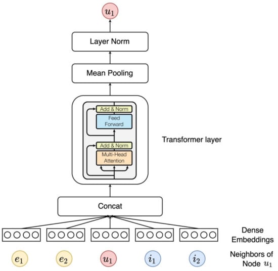 In this model, transformer is applied to the neighbor aggregation of nodes in an ICKG graph. As shown in Figure 6, the neighbors of the nodes do not have the concept of order, so the transformer’s position embedding is not used. The core of the transformer is the multi-head self-attention layer [], and then the residual connection [] and layer normalization mechanism [] are added. Next, we introduce the principle of transformer cross-aggregation by the example of item neighbor cross-aggregation.
